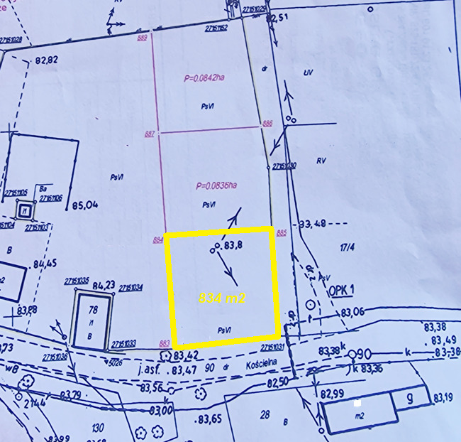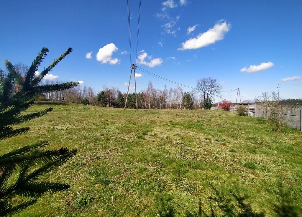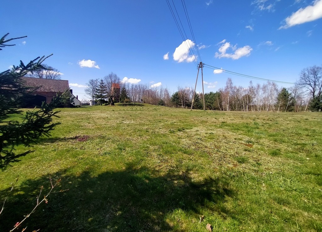 Działka częściowo ogrodzona, z wjazdem od strony wschodniej, teren lekko nachylony, nad działką przebiega napowietrzna linia energetyczna niskiego napięcia.