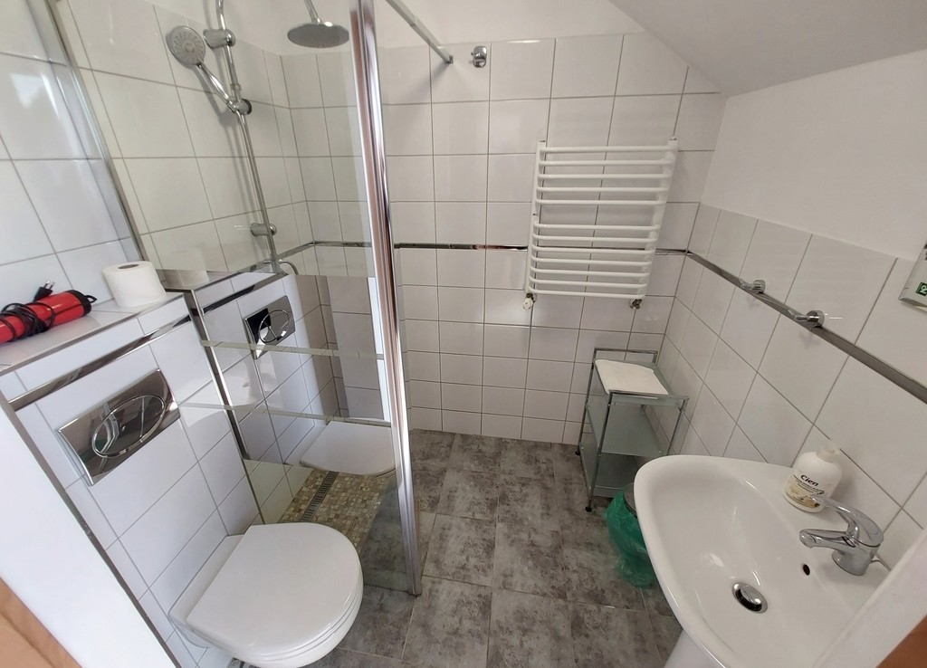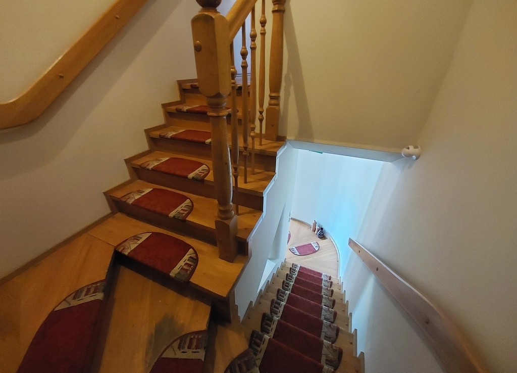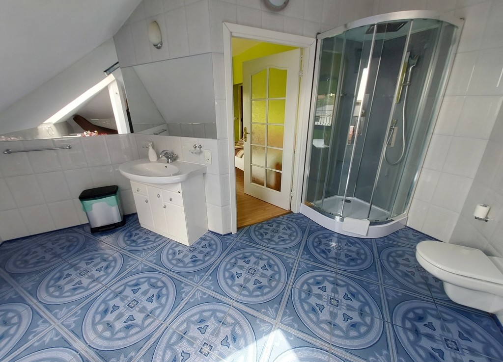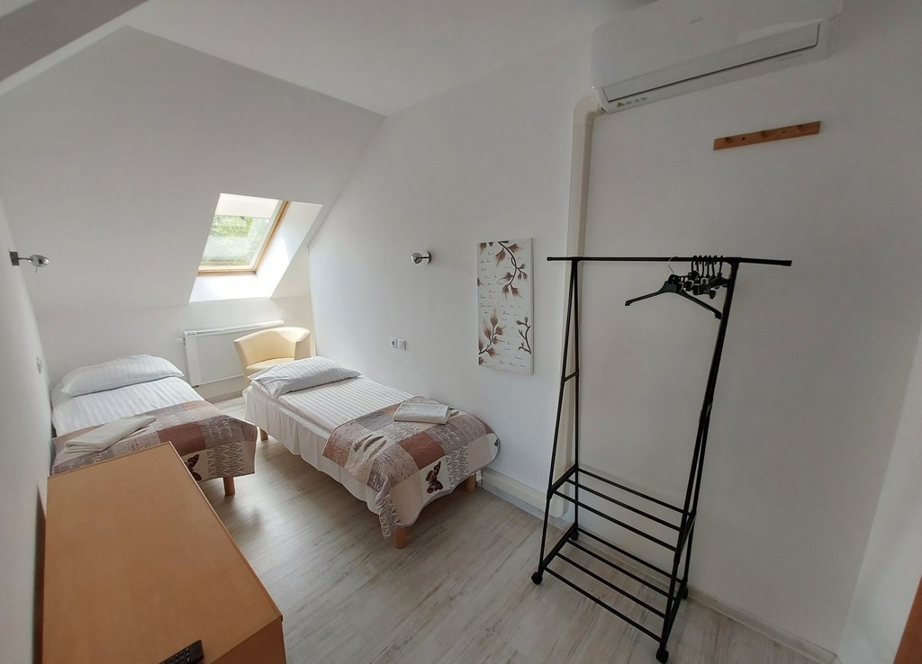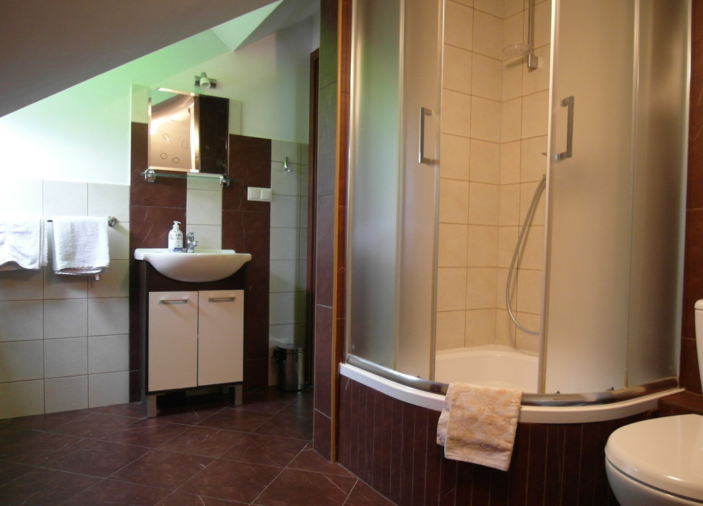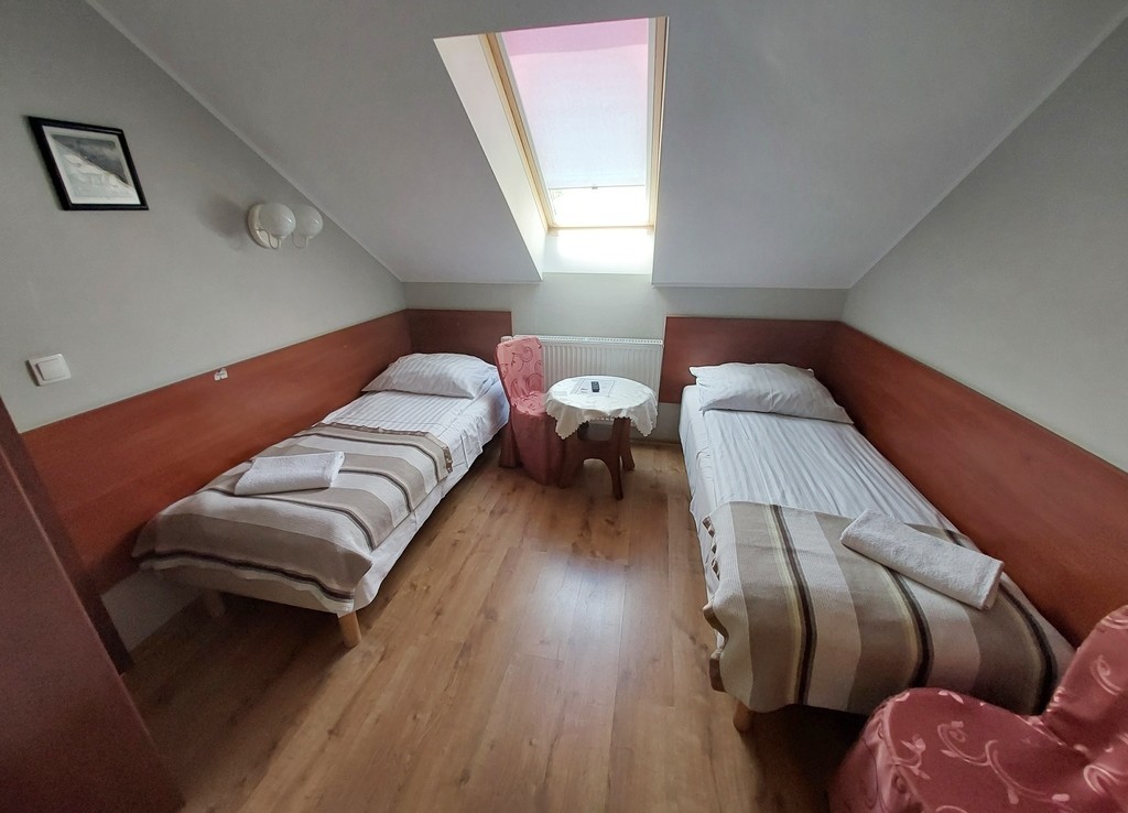 Na PIĘTRO prowadzą drewniane schody. Na półpiętrze mieszczą się 3 pokoje – 2 i 3 osobowe, każdy z własną łazienką. Na pierwszym poziomie znajduje się obszerny hol z aneksem kuchennym i wyjściem na mały balkon oraz 6 pokoi – 2, 3 i 4 osobowych z łazienkami.