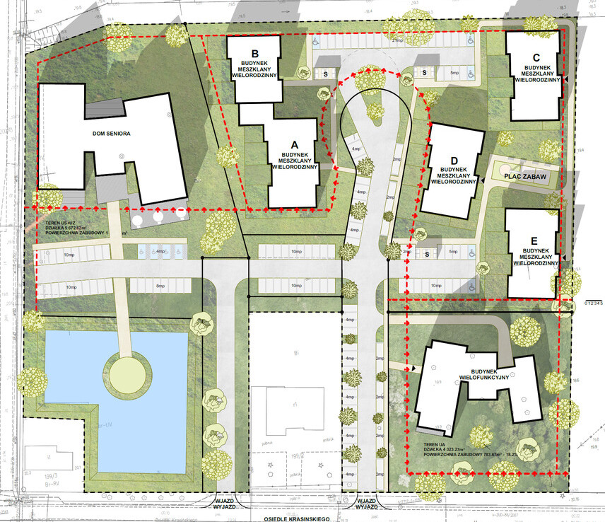 Koncepcja obejmuje nowoczesny dom seniora o powierzchni 4.900 m2 wraz z obiektami towarzyszącymi. Teren posiada też wolne pola inwestycyjne, przeznaczone w MPZP pod budowę wielorodzinnych budynków mieszkalno – usługowych. Działka objęta planem miejscowym ze strefami o zróżnicowanym przeznaczeniu: M+U tereny mieszkaniowo – usługowe, UA – tereny usługowo – administracyjne i US+UZ tereny usług socjalno – zdrowotnych.