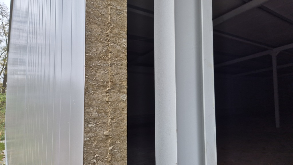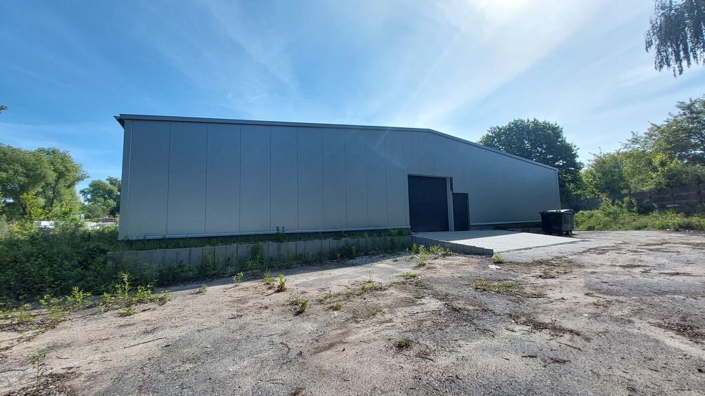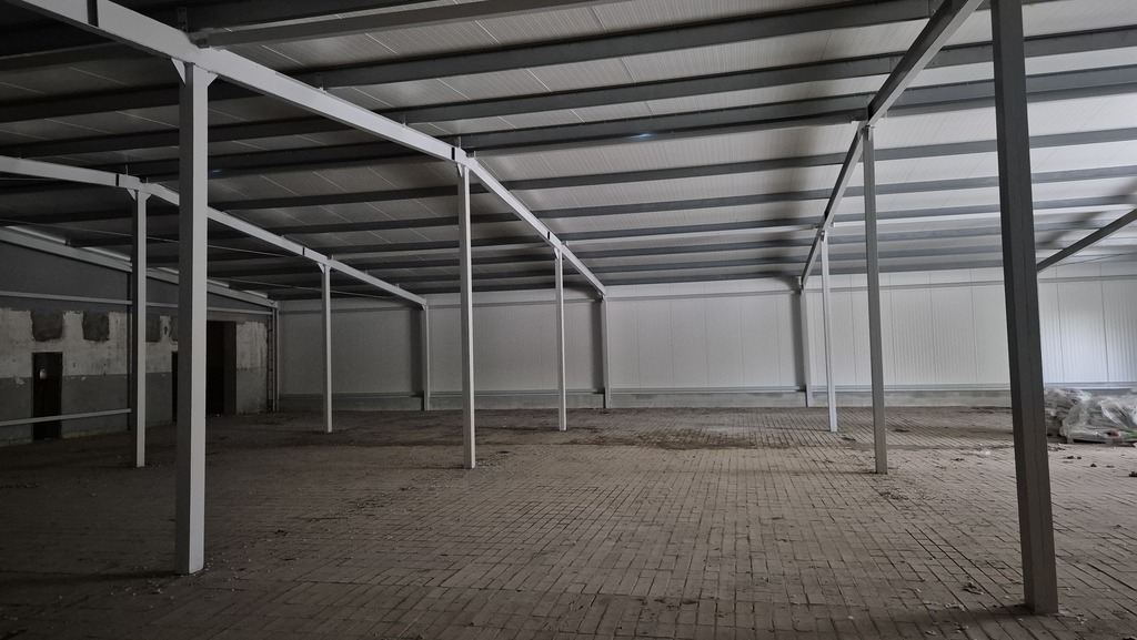 Nowa hala o konstrukcji metalowej z obudową z płyt warstwowych (10cm). Hala w trakcie robót wykończeniowych, gdzie przewiduje się montaż bramy segmentowej, instalacji elektrycznej i oświetleniowej.