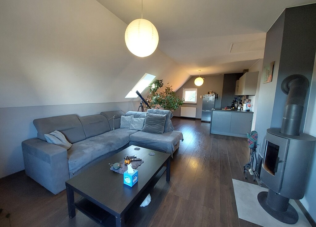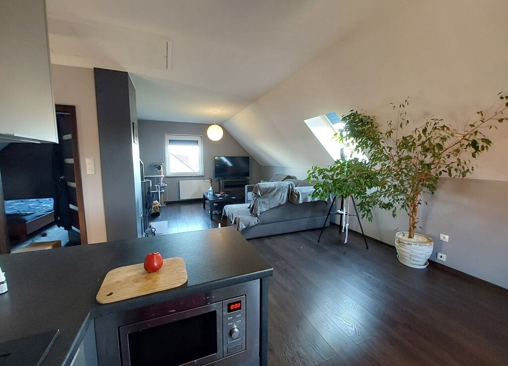 Poddasze: część mieszkalna 43 m2: pokój dzienny z aneksem kuchennym, sypialnia, łazienka, komunikacja.