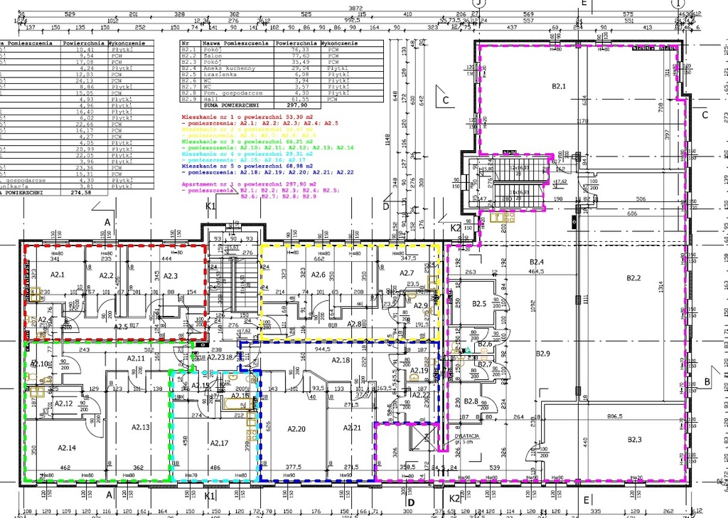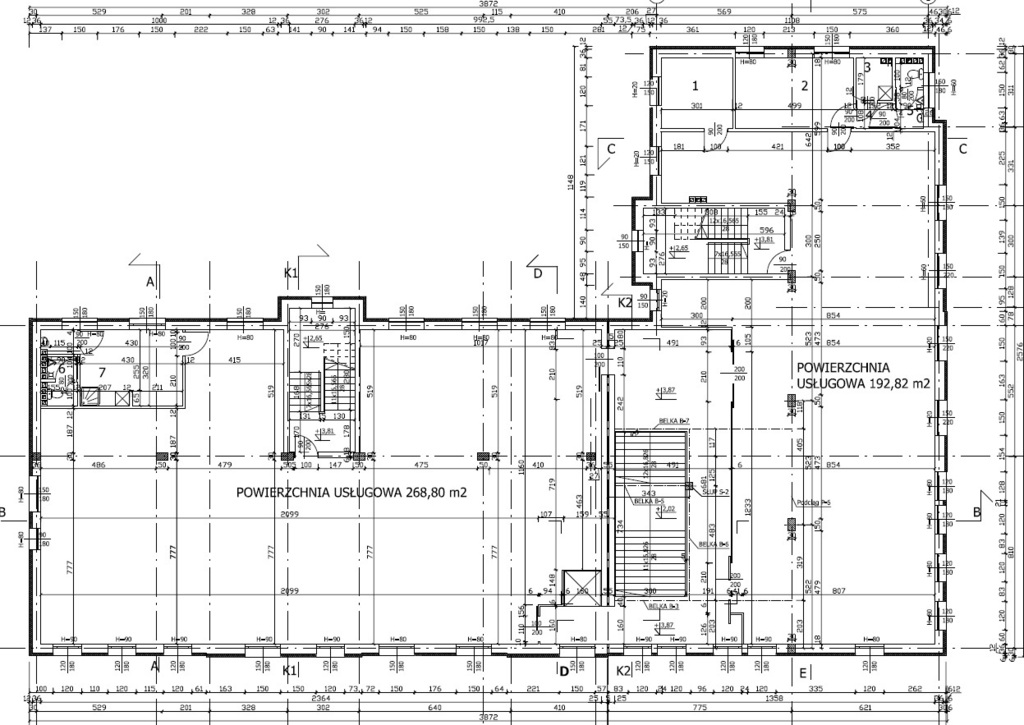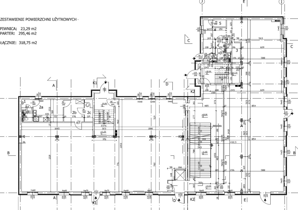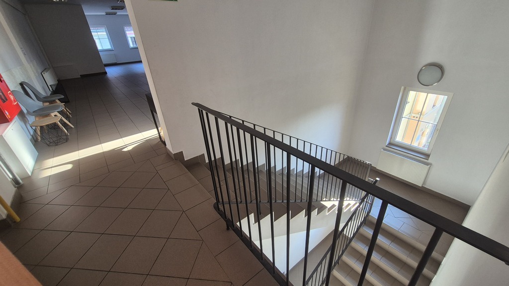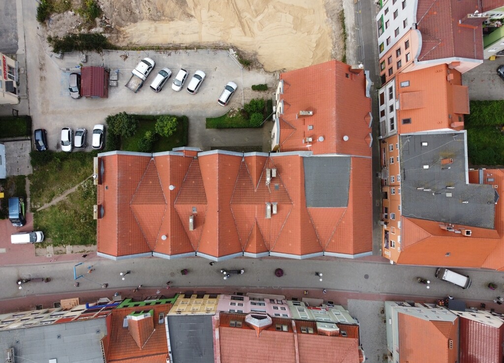BUDYNEK trzykondygnacyjny, w kształcie litery L, w pełni podpiwniczony, z dwiema klatkami schodowymi i niezależnymi wejściami do części parterowej i do lokali usługowych/mieszkalnych na pozostałych kondygnacjach. Wysokości kondygnacji parterowej i I pietra wynoszą 3,5m, a poddasza 2,5m. Łączna powierzchnia użytkowa kondygnacji nadziemnych wynosi 1.624,00 m2. Budynek został wzniesiony w 2008 r. w technologii tradycyjnej z cegły silikatowej, ocieplony styropianem 15cm. Stropy – płyty kanałowe. Dach dwuspadowy o konstrukcji drewnianej, kryty dachówką ceramiczną, ocieplony 16cm wełną mineralną. Rynny i rury spustowe z blachy tytanowo – cynkowej. Kominy z cegły klinkierowej. Okna PCV powlekane, drzwi wejściowe w ramach aluminiowych, parapety metalowe. Posadzi płytki gres.