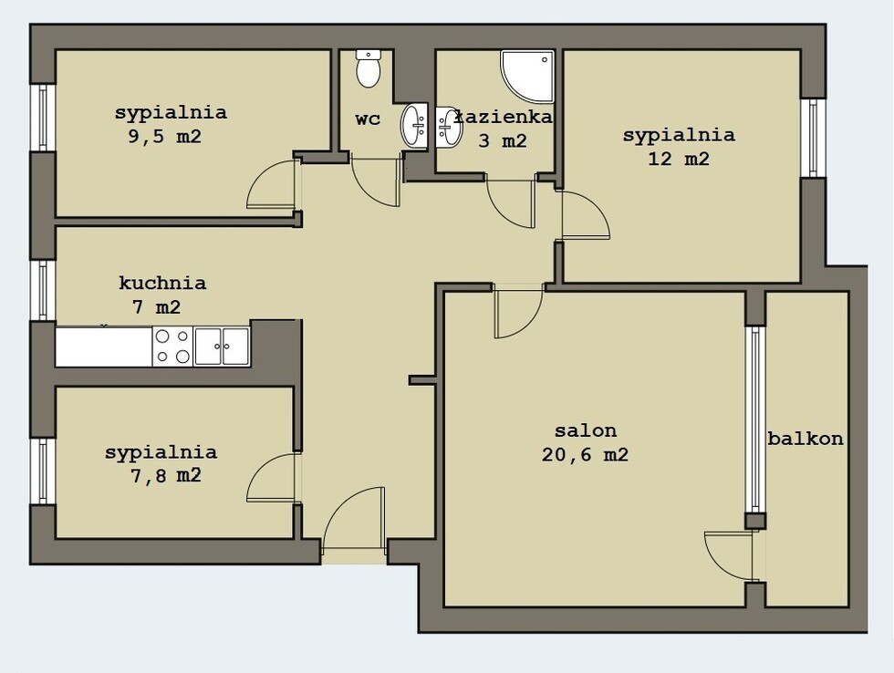 UKŁAD POMIESZCZEŃ: salon z dużym, panoramicznym oknem i wyjściem na balkon w formie loggii na całą szerokość pokoju, 3 foremne sypialnie, oddzielna kuchnia z oknem, łazienka z prysznicem, oddzielne WC, ogromny przedpokój. Do mieszkania przynależą dwie duże piwnice.