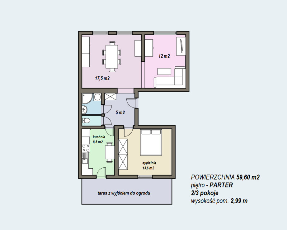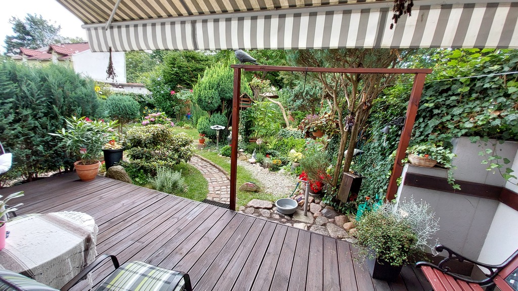 Przestronny salon z kominkiem (powstał z połączenia 2 pokoi – łatwa możliwość przedzielenia) sypialnia z oknem wychodzącym na zieleń, kuchnia z wyjściem na taras i do pięknie zagospodarowanego ogrodu oraz oddzielne wc i łazienka z prysznicem.